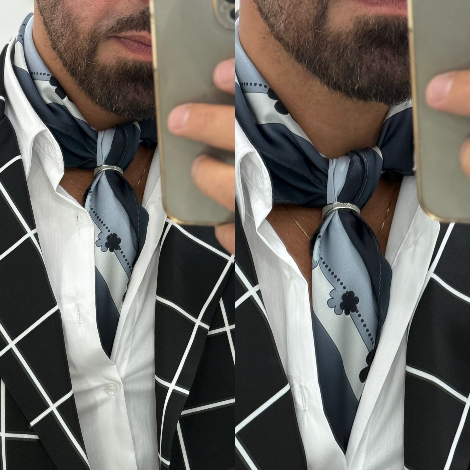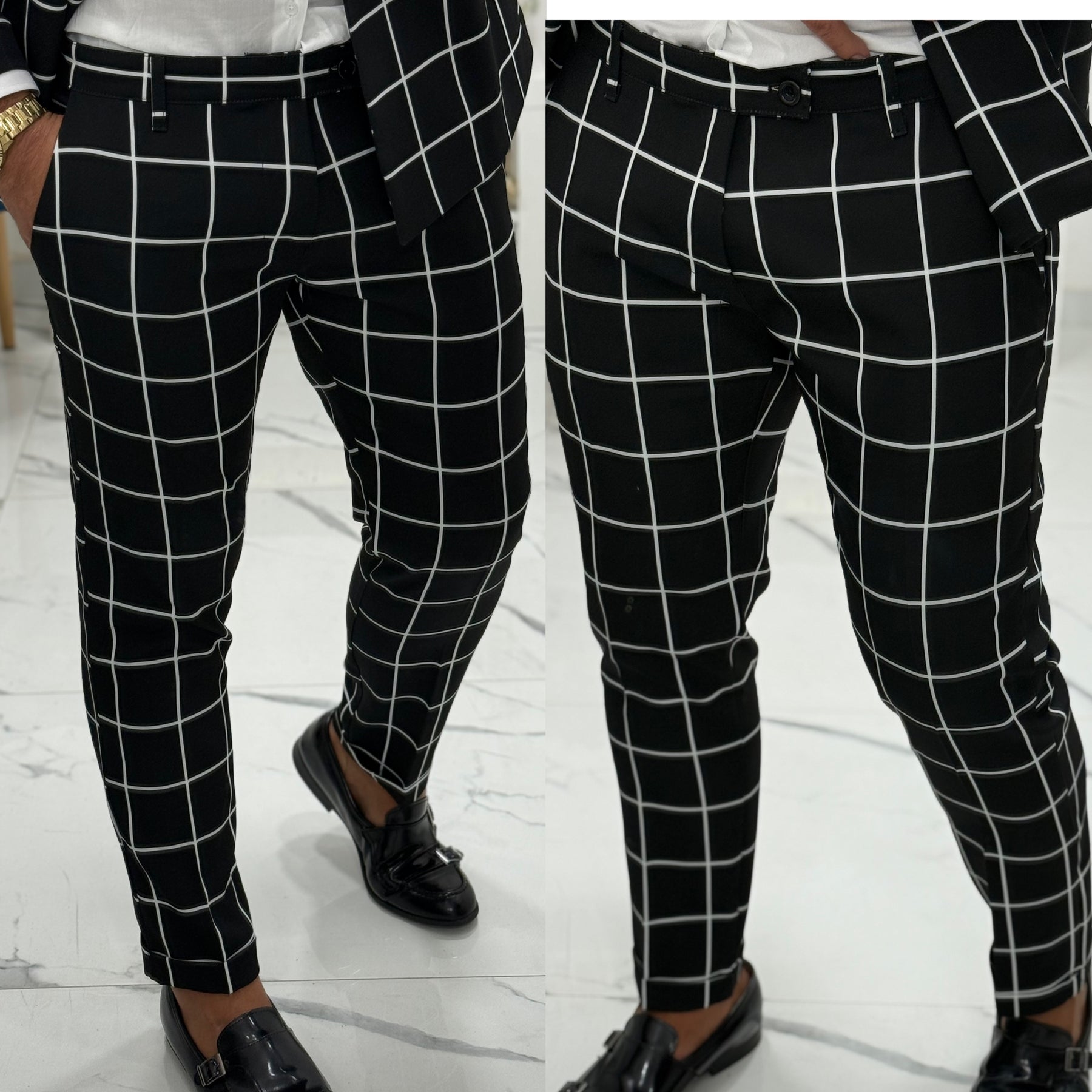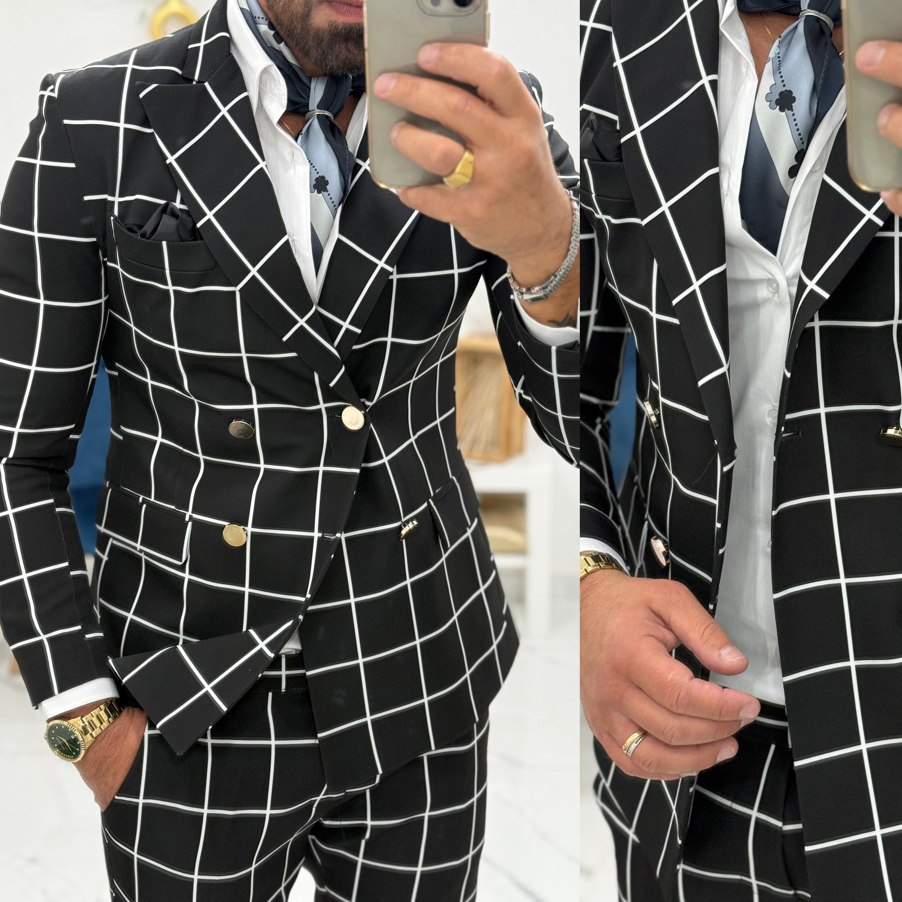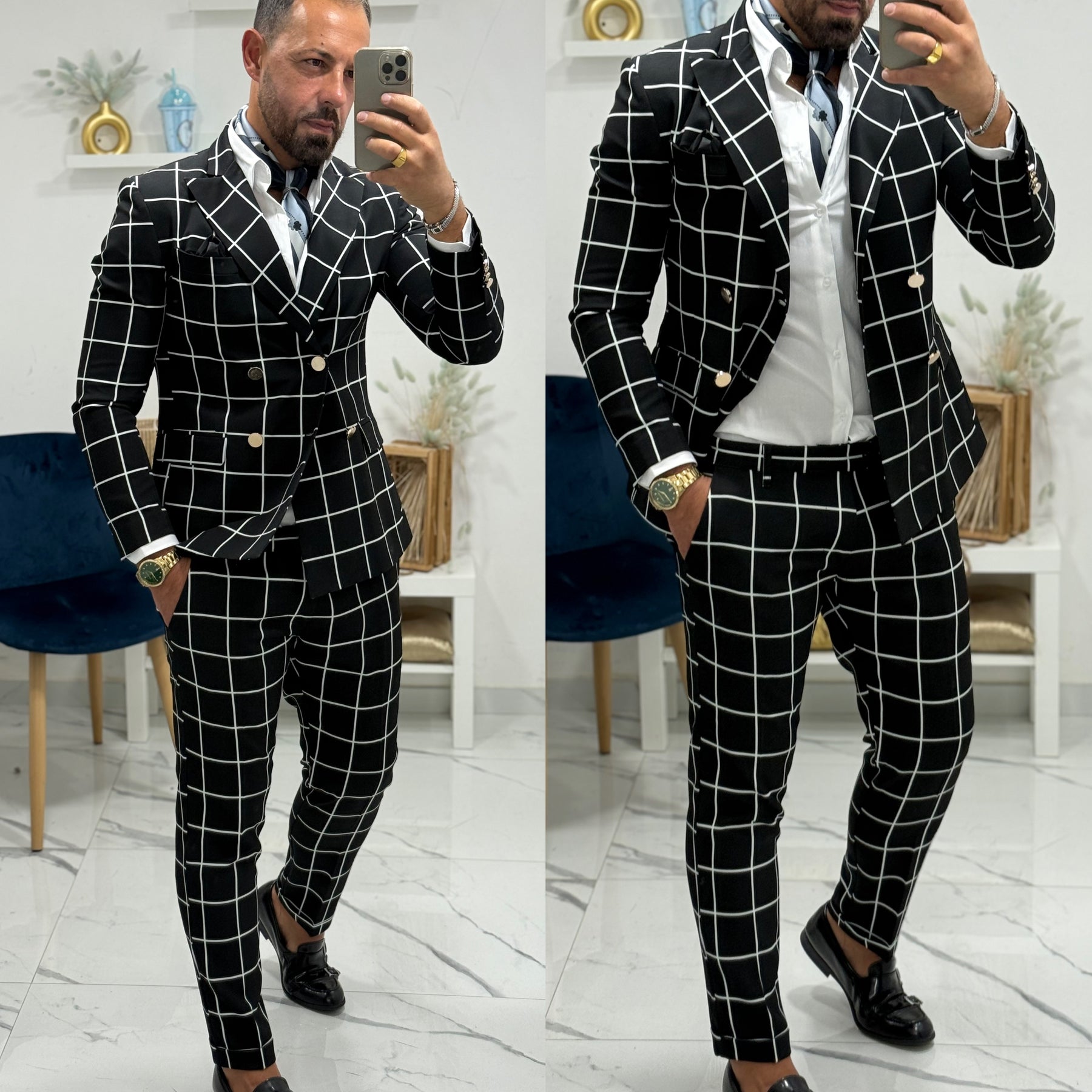 Abito doppiopetto quadri Fantasy Bottoni oro gioiello il modello indossa 50 pesa 89 kg è alto 1,79